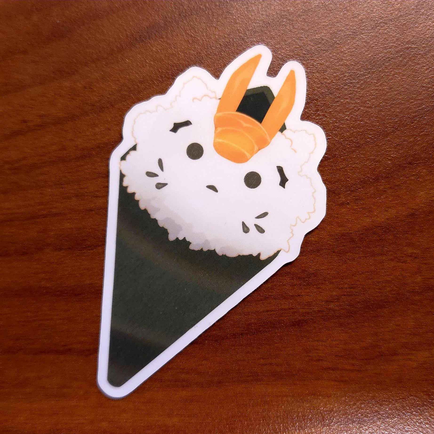 This handmade roll is made with salmon, sesame seed and rice. It is full of flavor and bite-sized goodness. Excellent to stick on your water bottles, laptops and other items!